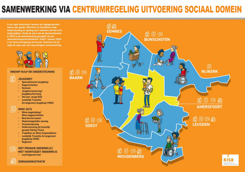 - Regionale inkoop en uitvoering van het sociaal domein is per 1 januari 2026 ondergebracht in de ‘Centrumregeling Uitvoering Sociaal Domein’. Gemeente Amersfoort voert de centrumregeling uit voor alle gemeenten in Regio Amersfoort. Dit geldt onder meer voor (boven)regionale gespecialiseerde jeugdhulp, Wmo-voorzieningen, maatschappelijke ondersteuning en maatschappelijke opvang.